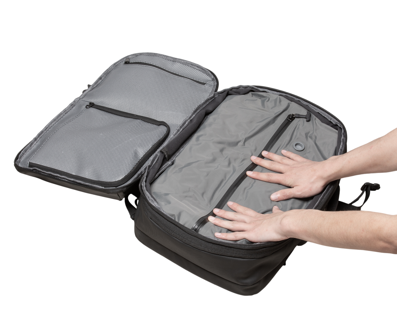 Revolutionary space saving backpack that compresses your belongings by 50% - No separate compression bags needed!